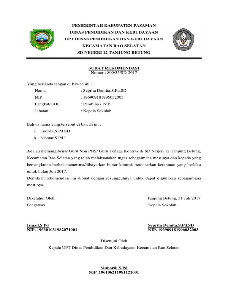 Contoh surat rekomendasi kepala sekolah · nomor : Anggota dprd jabar yang buat surat rekomendasi siswa masuk smkn 4 bandung minta maaf pikiran rakyat com. Contoh surat rekomendasi dan usulan penerbitan sk guru honor dari dinas pendidikan dan kebudayaan kab/kota tempat bertugas. Contoh format surat rekomendasi dari kepala sekolah kepada guru untuk mengikuti ppgj pemerintah kabupaten cilacap upt dinas pendidikan pemuda . Demikian surat pernyataan ini dibuat untuk . Adapun surat persetujuan dari sekolah yang akan di tuju oleh guru yang melakukan pindah tugas mengajar yaitu biasanya di sebut dengan surat lolos butuh yang di .